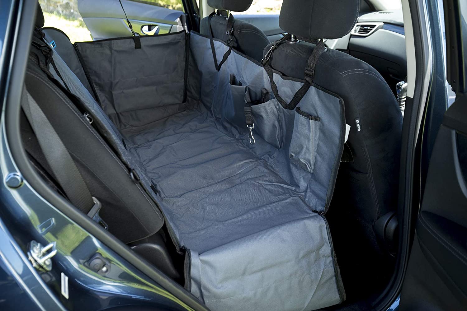 It also defends your back seat and door panels from dirt, dust, and hair. This hammock is compact and can be folded for easy storage when not in use. Crafted with a durable fabric, adjustable straps, quick connect snaps, and non-slip backing, it offers a secure fit. The hammock also has storage pockets and access holes in the base to easily attach the safety harness.